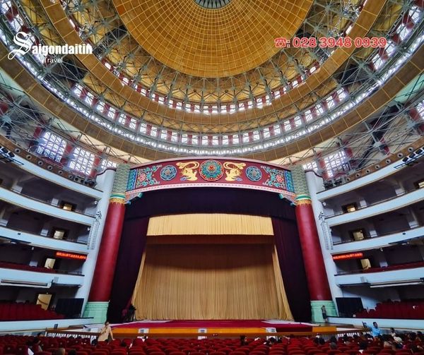 Bên trong hội trường chính có sức chứa hơn 4.000 chỗ ngồi, được bố trí theo hình vòm tròn đồng tâm, giúp mọi vị trí đều có tầm nhìn tốt hướng về sân khấu trung tâm. Trần hội trường được trang trí tỉ mỉ với họa tiết hoa văn truyền thống, điểm nhấn là đèn chùm pha lê lớn treo giữa mái vòm – biểu tượng của sự phồn vinh và ánh sáng.