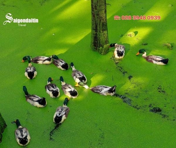 Vào mùa thu, bèo dày và sắc xanh đậm, thuyền lướt nhẹ qua các hàng cây – như xuyên một bức tranh thiên nhiên sống động.