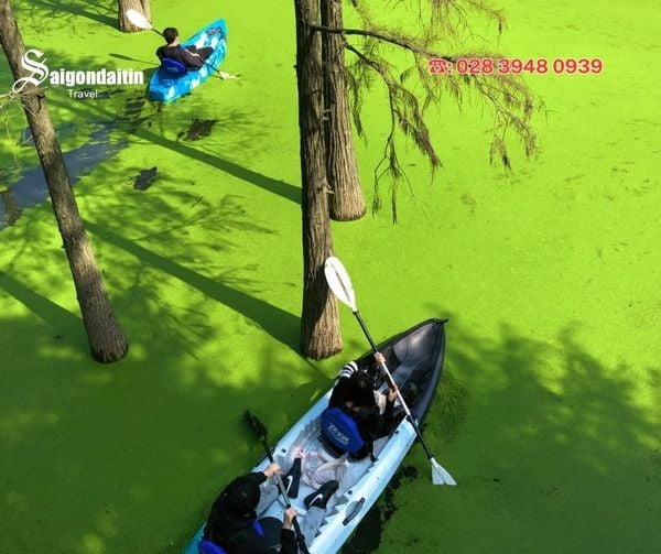 Một trong những trải nghiệm được đánh giá cao là chèo thuyền hoặc kayak giữa khu rừng nước – nơi các cây thủy tùng mọc trong nước, bèo phủ mặt hồ, ánh sáng lọt qua tán lá tạo hiệu ứng lung linh huyền ảo.