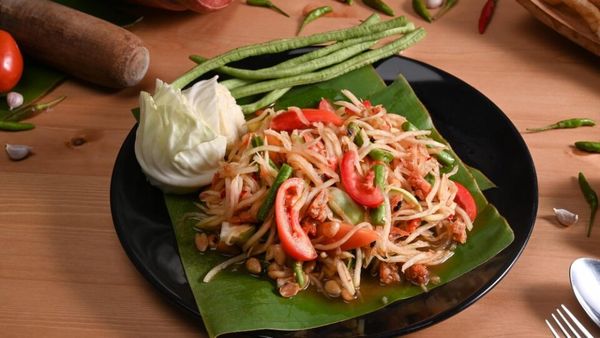 Đây là “linh hồn” của ẩm thực đường phố Thái. Đu đủ bào sợi giòn giòn, trộn cùng ớt, chanh, tỏi, nước mắm và đường thốt nốt. Vị cay nồng hòa cùng chua mặn ngọt cực kỳ bắt miệng. Người Thái thường ăn Som Tum cùng gà nướng hoặc xôi nếp, tạo thành combo “huyền thoại” mà bạn sẽ thấy ở hầu hết các khu chợ đêm.