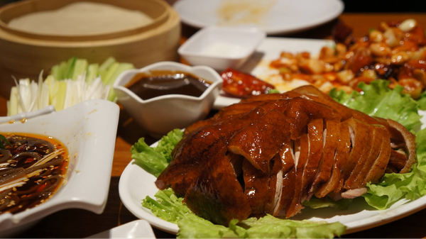 - Vịt quay Bắc Kinh: Lớp da vàng giòn rụm, thịt mềm ngọt, cuốn cùng bánh mỏng, hành lá, dưa chuột và sốt ngọt đặc biệt.