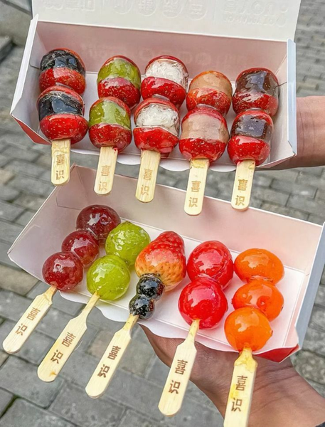 - Tanghulu (kẹo hồ lô): Trái cây xiên que phủ đường cứng giòn, bán nhiều ở Bắc Kinh và Thiên An Môn.