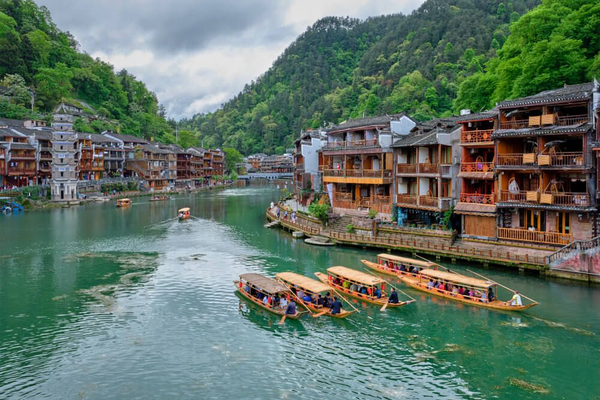 Phượng Hoàng Cổ Trấn: Thị trấn cổ ven sông Đà Giang, với những ngôi nhà gỗ cổ kính, cầu đá, tháp cổ và không gian lung linh ánh đèn lồng về đêm. Đây là một trong những cổ trấn đẹp nhất Trung Quốc, đặc biệt thích hợp để dạo thuyền ngắm cảnh.