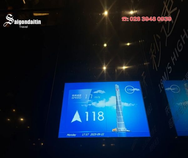 Trước khi đến được đài quan sát, du khách sẽ có cơ hội trải nghiệm thang máy siêu tốc của Tháp Thượng Hải – một trong những thang máy nhanh nhất thế giới, đạt tốc độ 18 mét/giây, tương đương hơn 74 km/giờ. Chỉ trong chưa đầy một phút, bạn sẽ được đưa từ tầng trệt lên tầng 118 trong cảm giác “vút lên trời cao” đầy phấn khích.